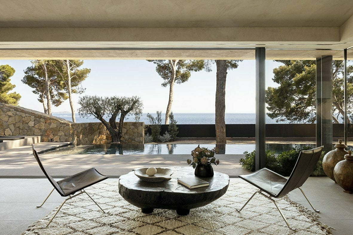 (intégrer image d’un tapis berbère en laine dans un salon sobre et lumineux)